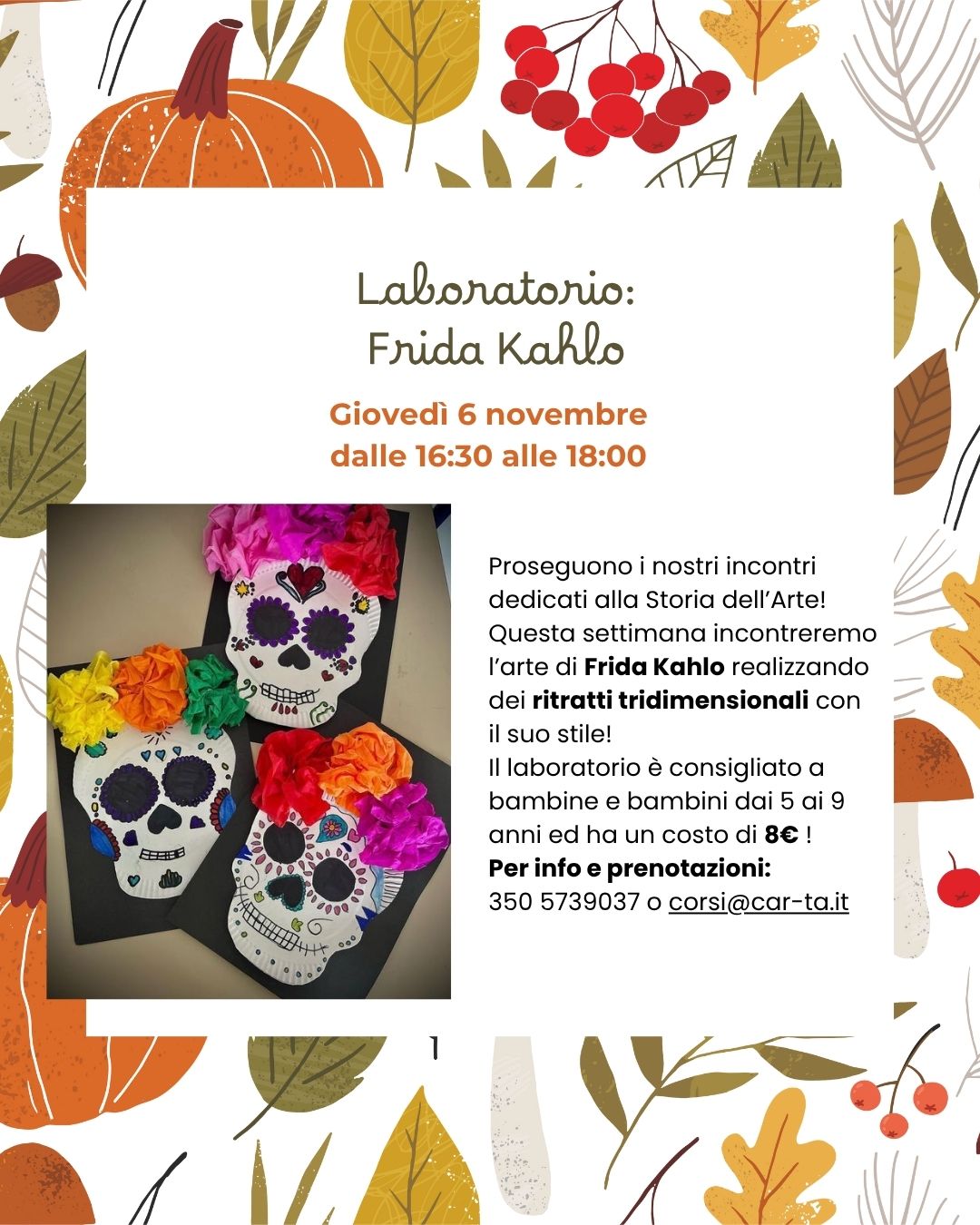 Giovedรฌ 6 novembre laboratorio ispirato a Frida Kahlo in cui realizzeremo dei ritratti tridimensionali con il suo stile!