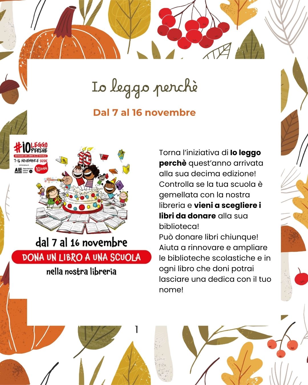 Torna lโiniziativa di Io leggo perchรจ questโanno arrivata alla sua decima edizione! Dal 7 al 16 novembre chiunque potrร donare dei libri alle biblioteche scolastiche! Controlla quali scuole sono gemellate con la nostra libreria!