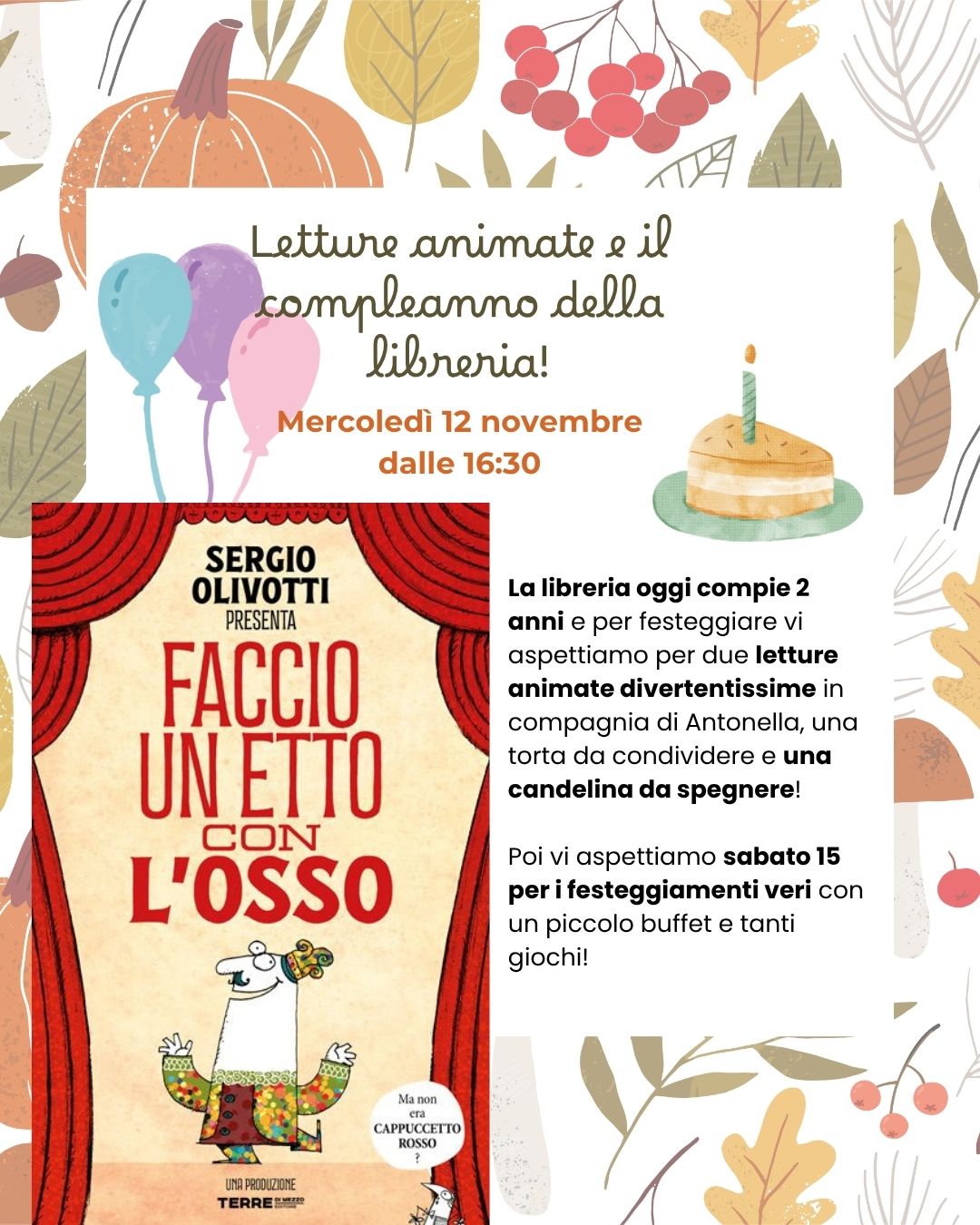 Mercoledรฌ 12 novembre la libreria compie 2 anni e per festeggiare vi aspettiamo per due letture animate divertentissime in compagnia di Antonella, una torta da condividere e una candelina da spegnere!