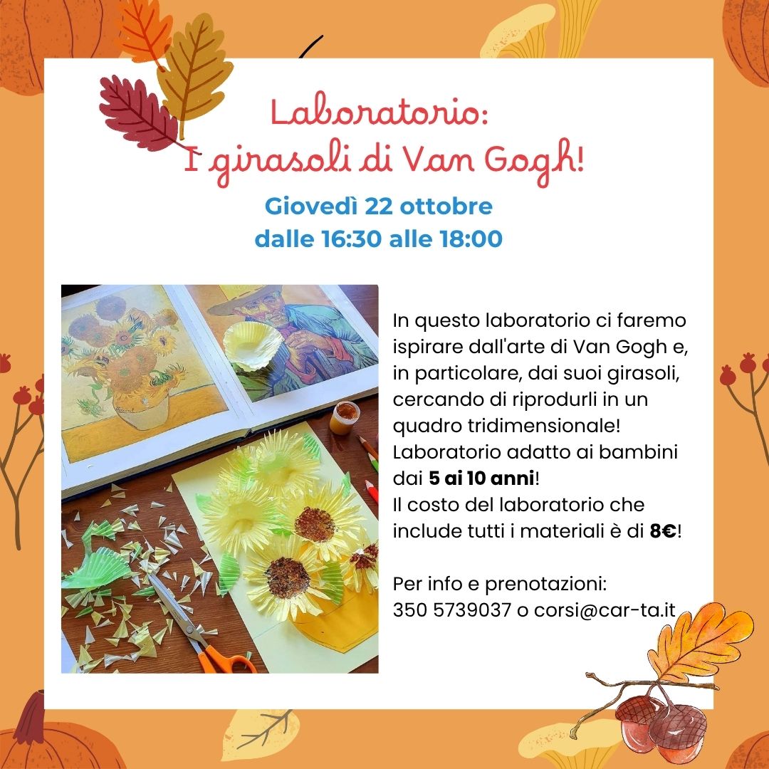 ci faremo ispirare dall'arte di Van Gogh e, in particolare, dai suoi girasoli, cercando di riprodurli in un quadro tridimensionale! Laboratorio adatto ai bambini dai 5 ai 10 anni!
